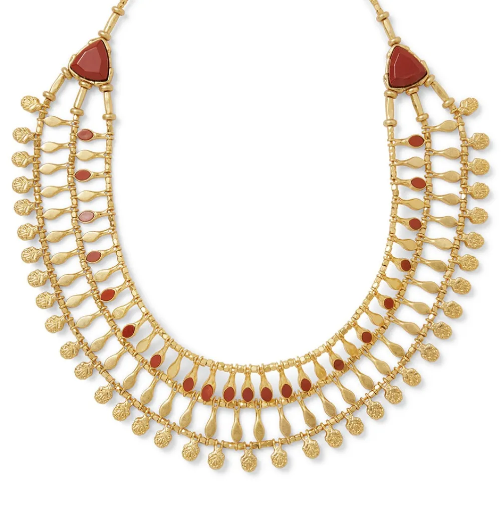 This handcrafted necklace evokes a splendid Egyptian collar (ca. 1504–1450 BCE) of amulets featuring the “nefer” hieroglyph, which signifies a word meaning “good” or “beautiful.” The auspicious symbolism of the Museum’s adornment suggests that it may have been made to bring good fortune to the wearer—in this case, a wife of the pharaoh Thutmose III. Our contemporary visions of this outstanding broad collar are both eye-catching and lightweight for an effortless statement.
