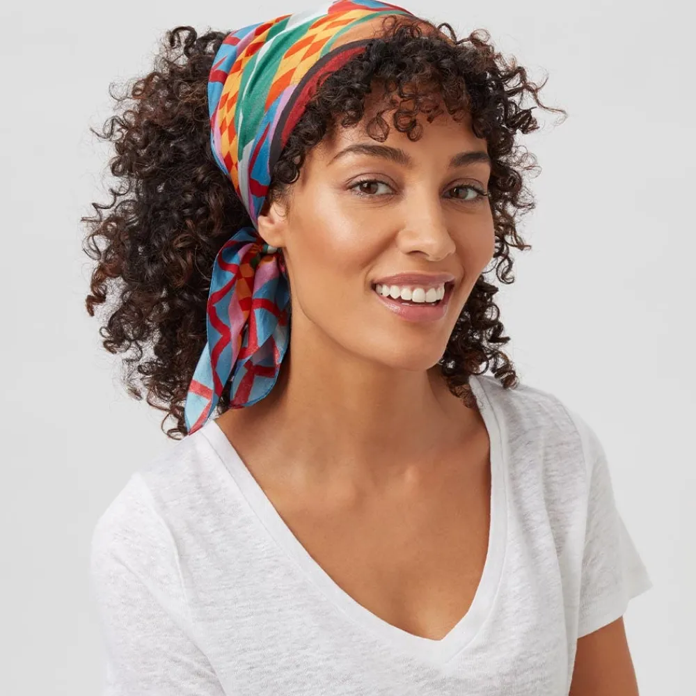 This colorful neckerchief features William Henry Johnson’s (American, 1901–1970) triple portrait of fabulously dressed young ladies, whose vibrant hats inform the patterns on the border. After living in Europe for more than a decade, Johnson returned to the US in 1938 and created a number of images portraying Black subjects. Johnson’s aesthetic shifted dramatically over the course of his career—he was influenced by the likes of Expressionism, African sculpture, and folk art, as is evident in the varied styles of his works.
